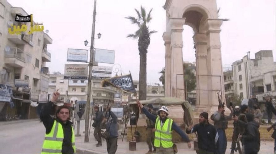 Sur la photo, un membre des Casques blancs (en jaune) tient un drapeau d’Al-Nosra (Al-Qaïda en Syrie).