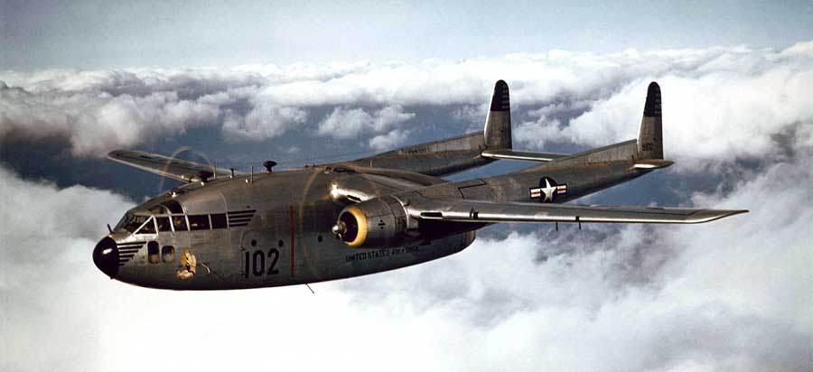 Un C-119 Flying Boxcar employé pour asperger du sulfure de zinc-cadmium sur des populations civiles.