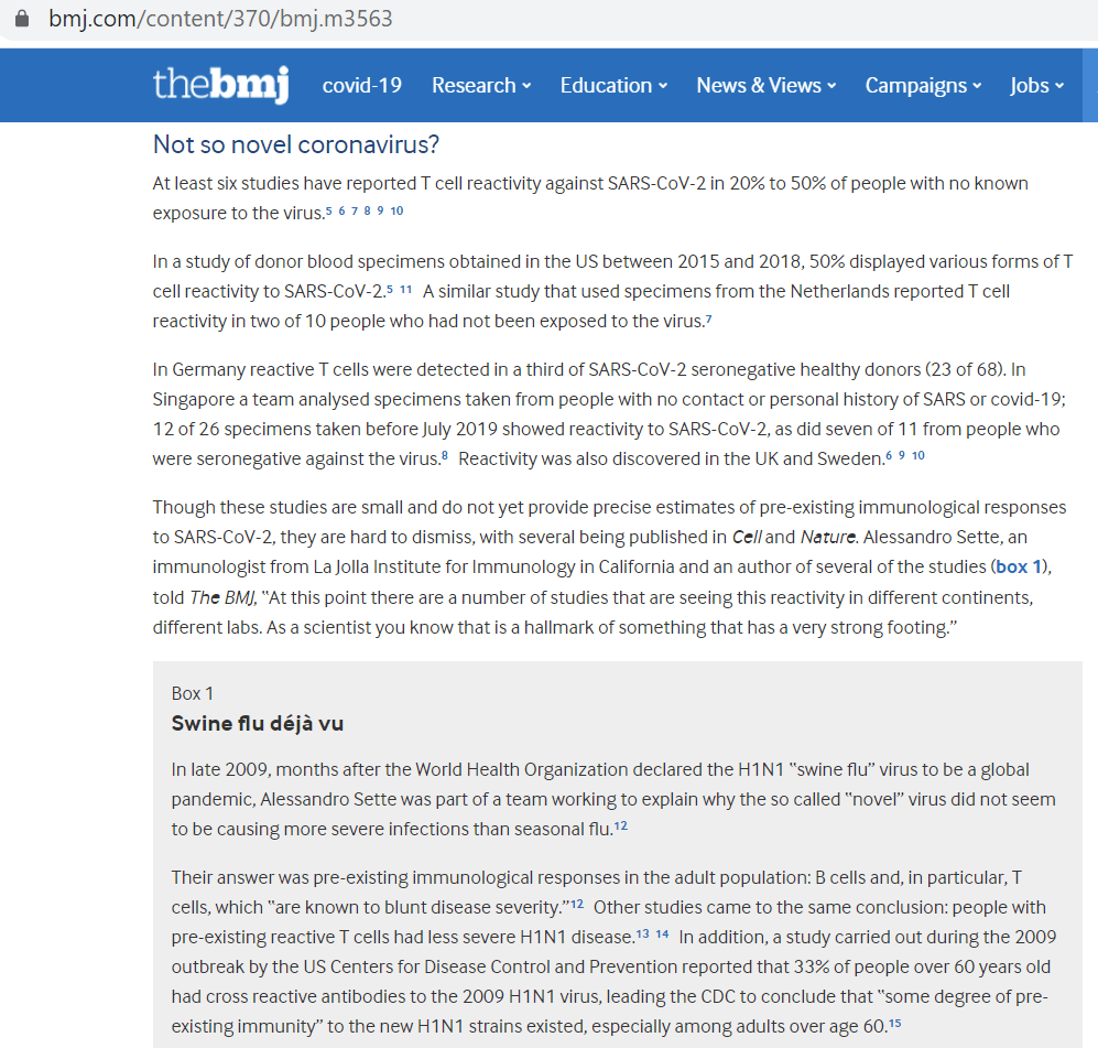 Peter Doshi fait un parallèle avec la pandémie H1N1 de 2009, que trop de journalistes semblent avoir oubliée. Alessandro Sette faisait alors « partie d’une équipe cherchant à expliquer pourquoi le soi-disant ‘‘nouveau’’ virus ne semblait pas causer d’infections plus graves que la grippe saisonnière ».