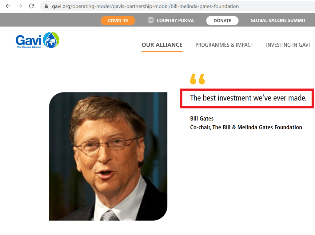 GAVI, fondée par Bill Gates, est le deuxième plus important donateur privé de l’OMS après la Fondation Gates. Le poids de GAVI et de la Fondation Gates confèrent donc au milliardaire une influence énorme sur les programmes de l’OMS, influence d’ailleurs critiquée par plusieurs personnes au sein de l’organisation selon un article de Politico publié en 2017. (Voir Bill Gates, « expert en santé publique » : investir dans les vaccins, c’est payant!)