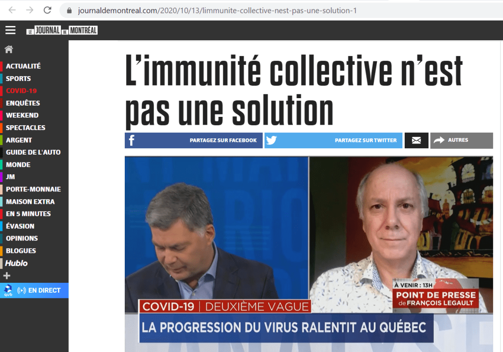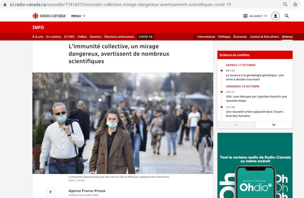 Peu après la publication de la déclaration de Great Barrington, les médias nous ont mis en garde contre l’idée d’immunité collective naturelle dans la lutte au nouveau coronavirus avec des titres alarmistes et sans équivoque comme « L’immunité collective, un mirage dangereux, avertissent de nombreux scientifiques », ou encore « L’immunité collective n’est pas une solution », lu respectivement sur les sites de Radio-Canada et du Journal de Montréal.