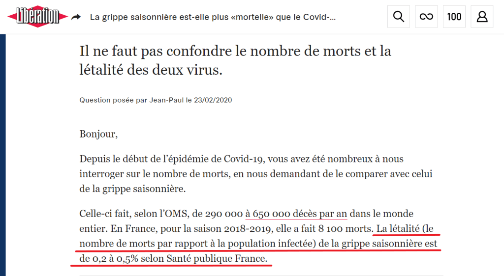 Les médias se sont empressés de remettre en question cette dernière statistique devenue virale chez les opposants aux mesures sanitaires. Par exemple, Libération a admis que ce calcul de 0,14 % est bon, tout en affirmant que l’on ne peut pas conclure que le taux de mortalité de la COVID est inférieur à celui de la grippe, car il s’agit d’une « extrapolation biaisée ». L’OMS estime pour sa part que le taux de létalité est à environ 0,6 %, ce qui ne concorde pas avec ses propres données et semble tout autant « extrapolé ».