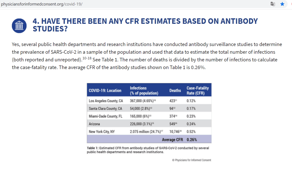Selon le groupe étasunien Physicians for Informed Consent (Médecins pour un consentement éclairé), le taux de létalité du virus était de 0,26 % en juin, soit similaire à celui de la grippe. Il s’agissait également de la meilleure estimation du Centers for Disease Control au même moment. Ce chiffre semble être le plus fiable puisqu’il est partagé par une source indépendante et une source gouvernementale.