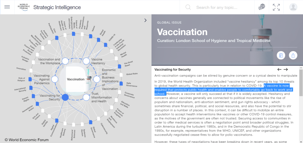 Le Forum économique mondial (FEM) va même jusqu’à dire qu’« un vaccin est désormais nécessaire pour protéger la santé publique et permettre aux gens de retourner confortablement au travail et à l’école ».