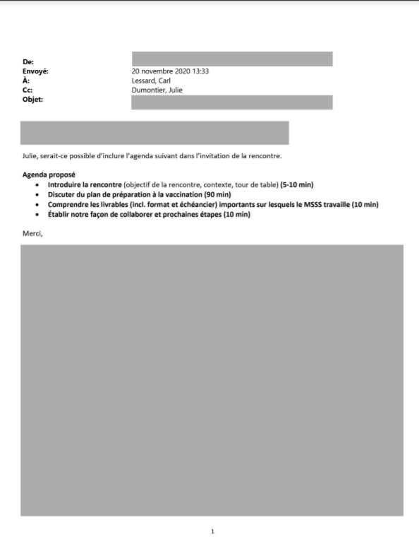 Dans un courriel du 23 novembre 2020 de X au Dr Nadine Sicard et Jérôme Gagnon du ministère de la Santé et des Services sociaux, en cc à Jean-Benoît Grégoire Rousseau, consultant chez McKinsey, on peut lire :