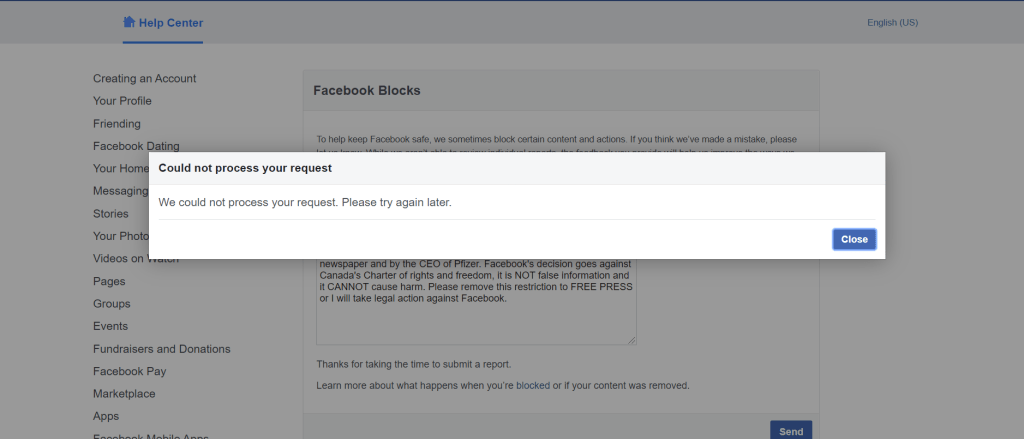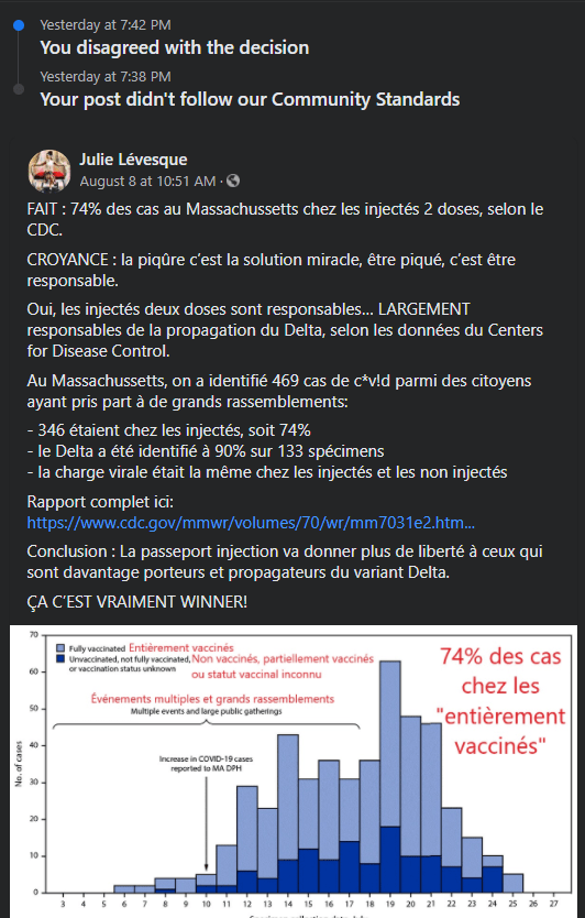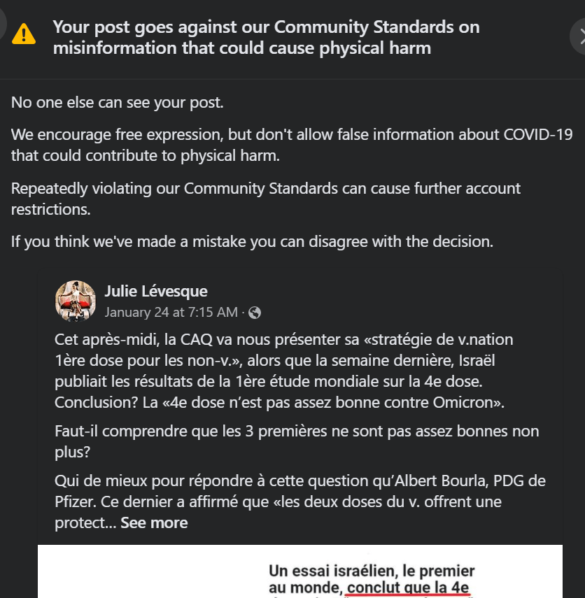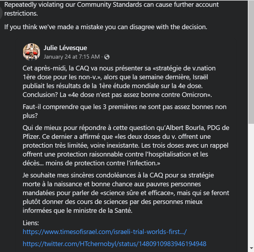 « Je suis journaliste et j’ai publié un article du Times of Israel et une vidéo d’Albert Bourla, PDG de Pfizer. Vous dites que ce sont de « fausses informations » « qui pourraient contribuer à des dommages physiques ». Rien ne pourrait être plus faux. J’ai répété ce qui a été dit dans un grand média et par le PDG de Pfizer. La décision de Facebook va à l’encontre de la Charte canadienne des droits et libertés, ce ne sont PAS de fausses informations et elles NE PEUVENT PAS causer de préjudices corporels. Veuillez enlever cette restriction à la LIBERTÉ DE PRESSE, sinon j’intenterai une action en justice contre Facebook. »