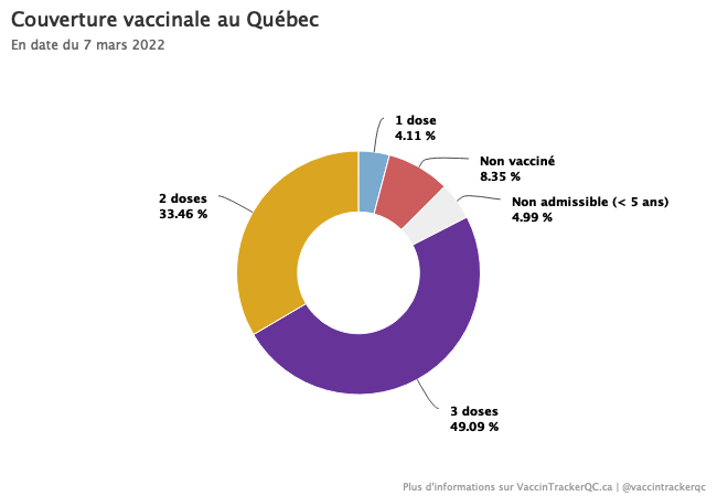 Pour terminer sur une note plus positive, notons que l’adhésion aux injections s’essouffle depuis la 2e dose. Comme on peut le voir sur ce graphique, moins de 50 % de la population québécoise est triple-dosée :