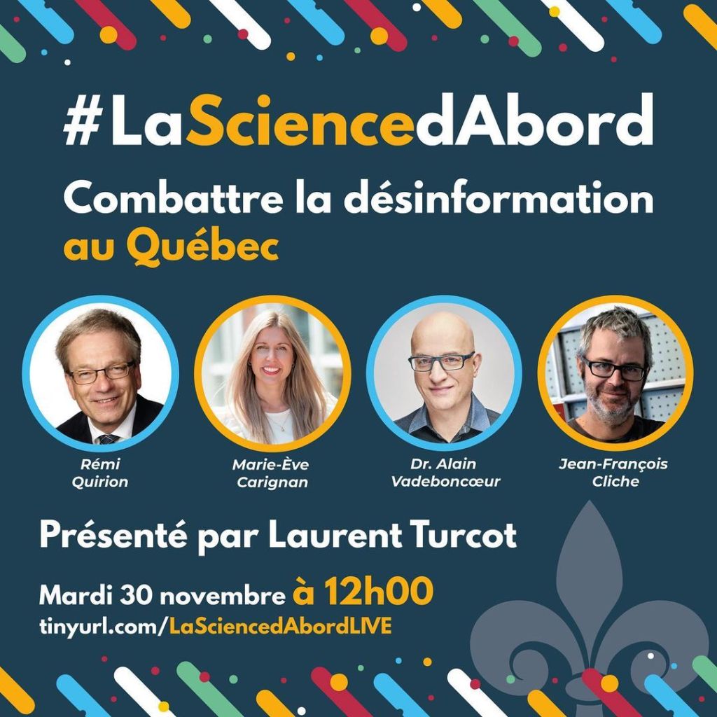 L’organisme a produit une série de directs sur la lutte à la désinformation en 2021, mettant en vedette la prolifique professeure, le scientifique en chef du Québec Rémi Quirion, le Dr Alain Vadeboncoeur et le journaliste « scientifique » du Soleil Jean-François Cliche, connu pour ses vérifications de faits discréditant tout ce qui s’oppose au dogme covidien.