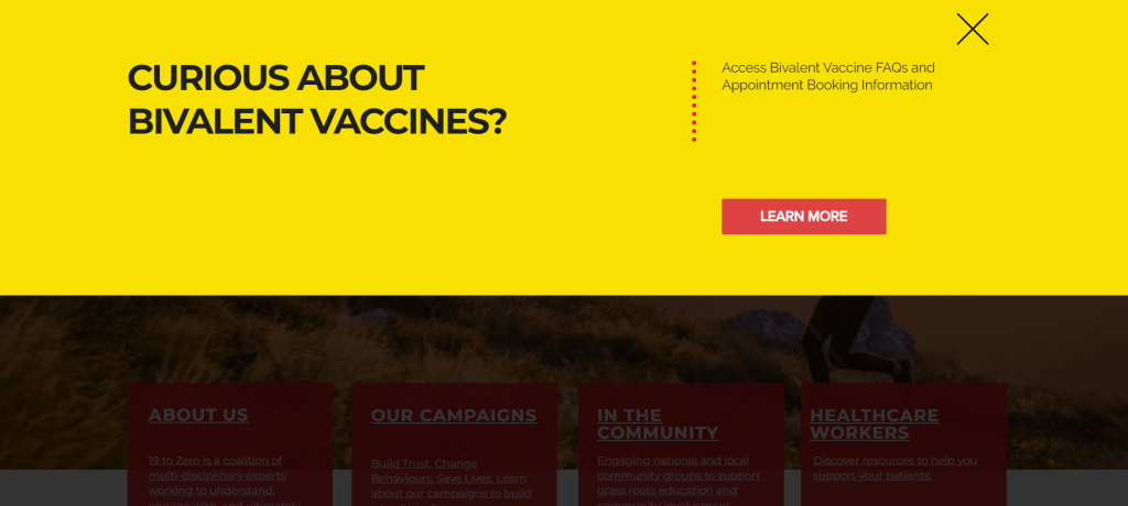 Lorsqu’on arrive sur la page de 19 to Zero, un pop up s’affiche immédiatement sur toute la page et pose la question : « Curieux d’en savoir plus sur les vaccins bivalents? ». Cet accueil est pour le moins révélateur.