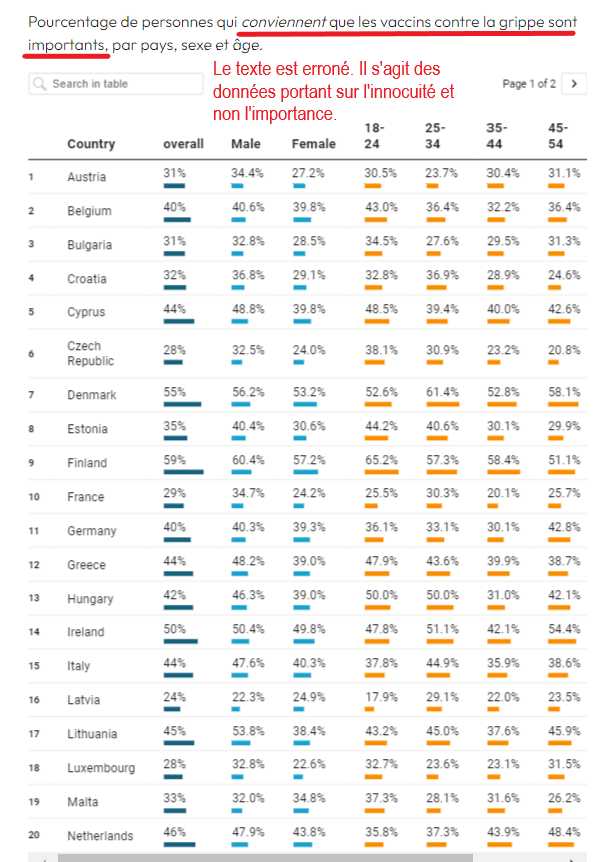 On peut voir les données pour chaque catégorie en téléchargeant la feuille Excel, comme celle-ci-dessous portant sur la question de l’innocuité des vaccins contre la grippe. La catégorie « Ni l’un ni l’autre » comprend le plus gros pourcentage, ce qui fausse complètement les résultats déjà peu reluisants :