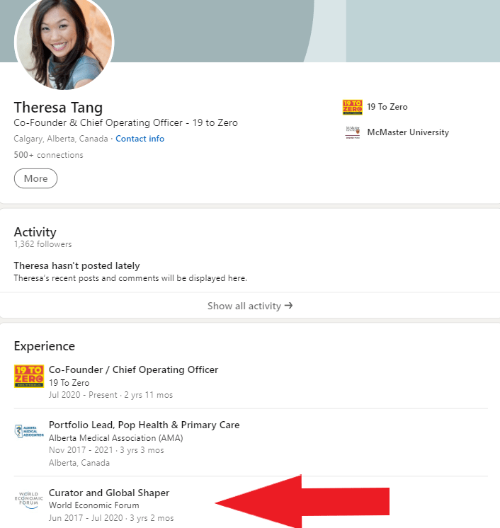 Notons que Mme Tang a été curatrice et « façonneuse mondiale » (global shaper) pour le Forum économique mondial (FEM) entre juin 2017 et juillet 2020.