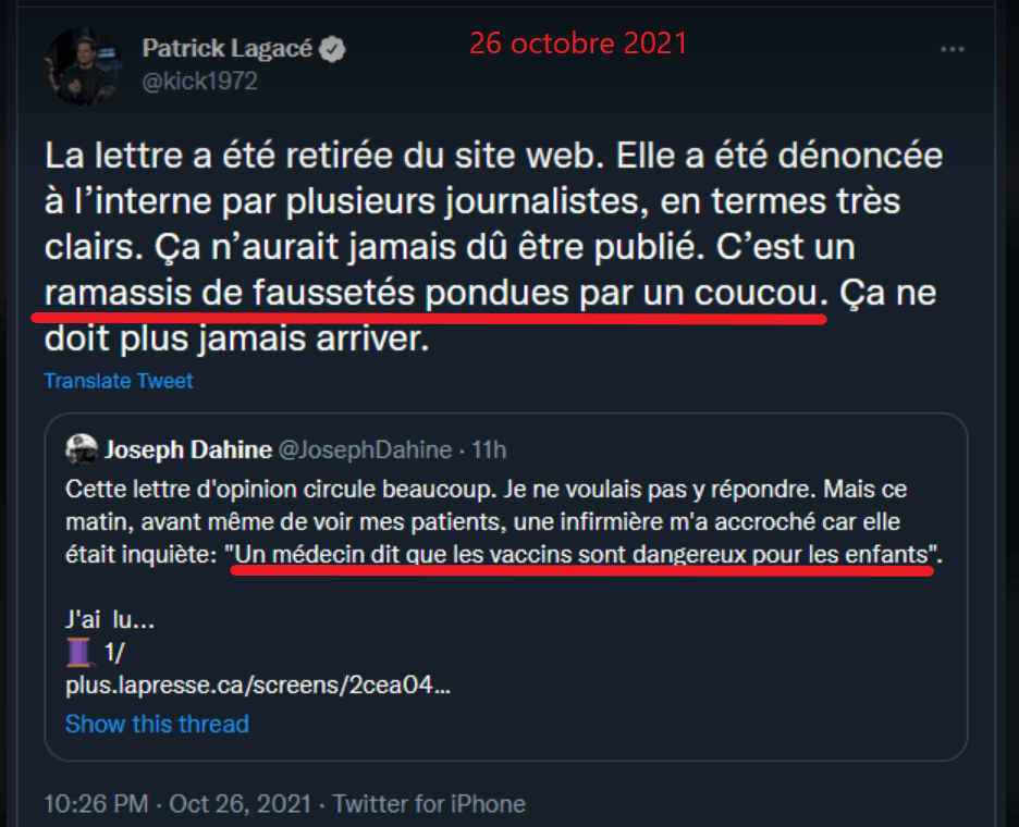 - le Dr René Lavigueur, médecin qui a osé critiquer la vaccination des enfants dans une lettre d’opinion publiée par La Presse, aussitôt censurée. Cette censure a d’ailleurs été applaudie par l’apôtre de l’injection expérimentale, dont les multiples infections à la covid n’ont su ébranler la foi (parodie vidéo ici), l’homme aux multiples chapeaux, l’inimitable journaliste-chroniqueur-animateur-commentateur Patrick Lagacé, pour qui le Dr Lavigueur n’est qu’un « coucou » qui a « pondu » un « ramassis de faussetés »;