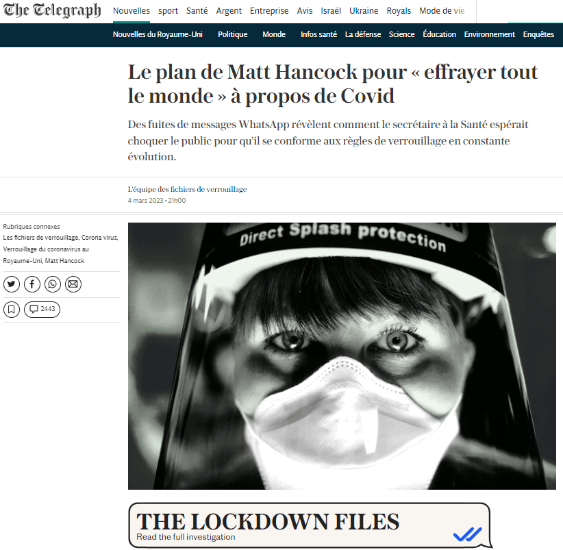 - les Lockdown Files (et ici) en exposant l’utilisation de techniques de manipulation par la peur (« guerre psychologique ») du gouvernement britannique, visant à provoquer la soumission de la population à des mesures non basées sur la science, techniques qui rappellent