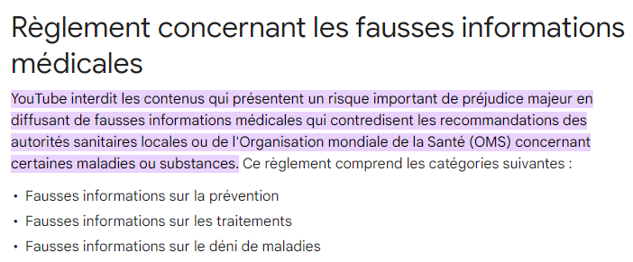 « YouTube interdit les contenus qui présentent un risque important de préjudice majeur en diffusant de fausses informations médicales qui contredisent les recommandations des autorités sanitaires locales ou de l’Organisation mondiale de la Santé (OMS) concernant certaines maladies ou substances. » (Soulignements ajoutés);