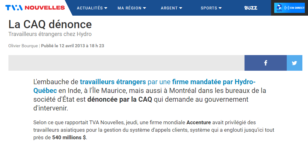En 2013, François Bonnardel, à l’époque porte-parole de la CAQ en matière de Ressources naturelles, dénonçait « un énorme dépassement de coûts » d’un programme mis en place par Hydro-Québec. La société d’État avait mandaté Accenture pour l’installation de systèmes informatiques et la firme avait engagé des travailleurs étrangers.