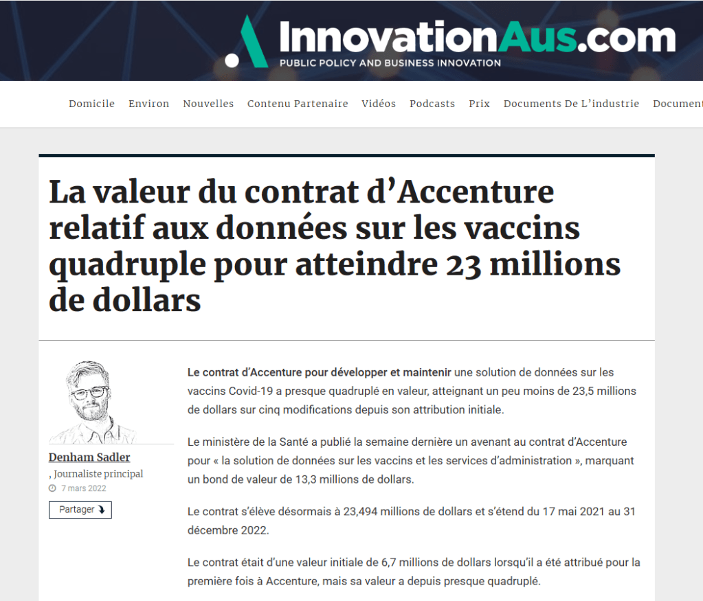Source : Denham Sadler, « Accenture’s vaccine data contract quadruples in value to $23m« , InnovationAus.com, 7 mars 2022.