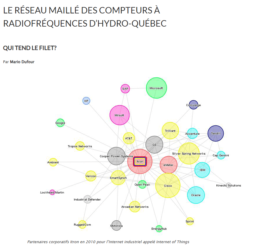 « Hydro-Québec se présente comme le maître d’œuvre d’un système maillé de compteurs à radiofréquences, pour lequel la société d’État aurait contracté la firme Accenture pour la conseiller. Ce qui saute aux yeux après analyse, c’est qu’Accenture mène ce projet, pour lequel elle se fait payer grassement par son sous-traitant (HQ), qui effectue le déploiement régional de son “automated meter reading- Advanced metering infrastructure” en compatibilité avec la technologie informatique du consortium auquel elle appartient, le Cisco Smart Grid Ecosystem. C’est un stratagème sophistiqué de ce qu’illustre l’expression “avoir le beurre et l’argent du beurre”. Un joyau d’autofinancement.