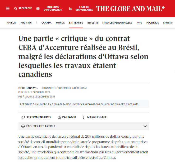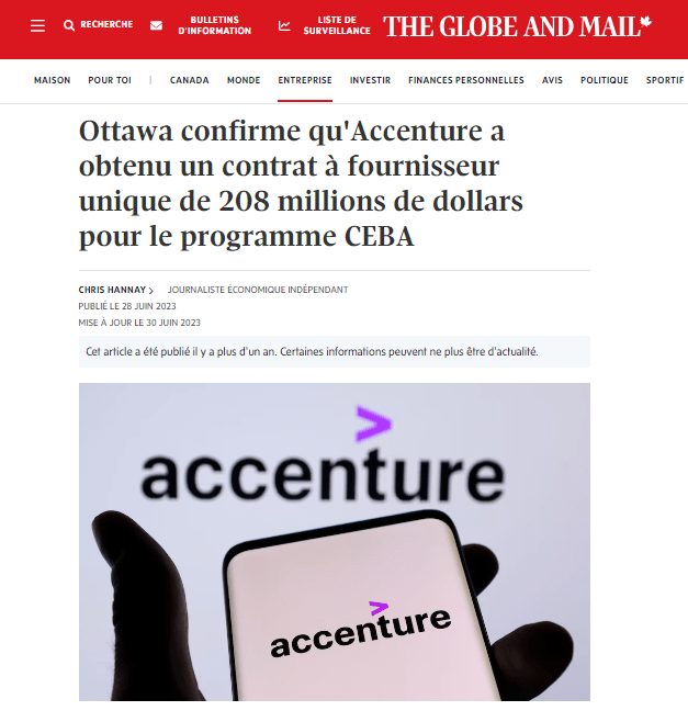 Le gouvernement fédéral a octroyé un contrat de gré à gré d’une valeur de 208 millions de dollars à Accenture pour administrer le Compte d’urgence pour les entreprises canadiennes (CUEC), un programme d’aide aux entreprises durant la covid. Selon le Globe and Mail :