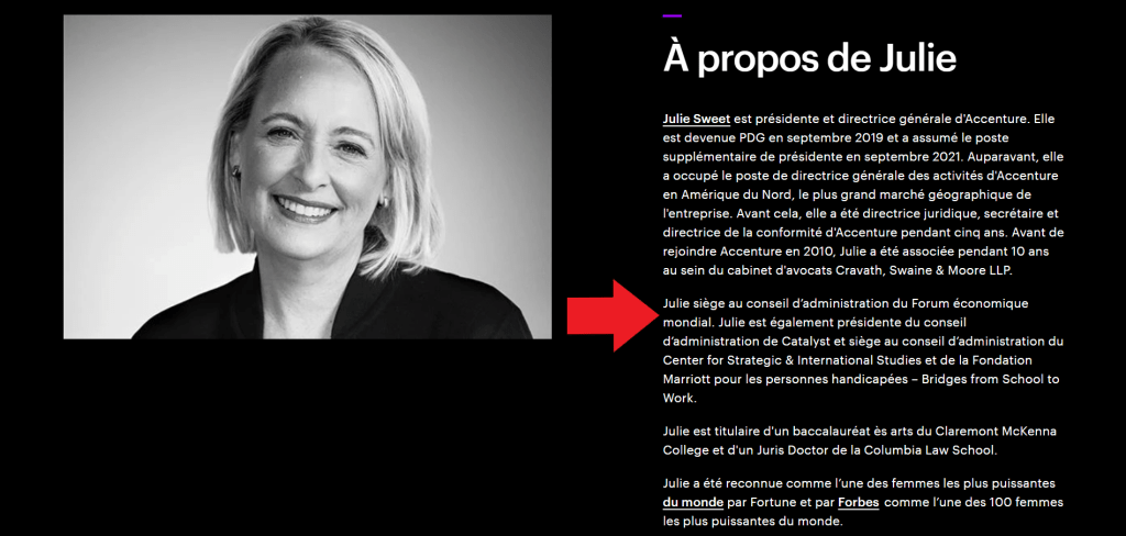 Julie Sweet, PDG d’Accenture, siège au conseil d’administration du Forum économique mondial.