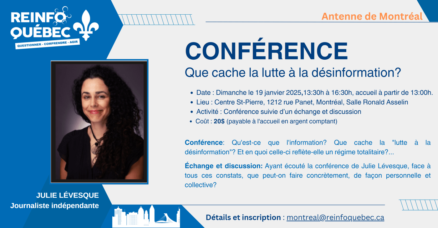 Vous êtes cordialement invités à venir explorer avec moi ce qui se cache derrière cette rhétorique totalitaire qui ne dit pas son nom lors de ma conférence intitulée « Que cache la lutte à la désinformation? », le 19 janvier à 13h30, à la Salle Ronald Asselin du Centre St-Pierre, 1212 rue Panet à Montréal, et ce pour la modique somme de 20$!