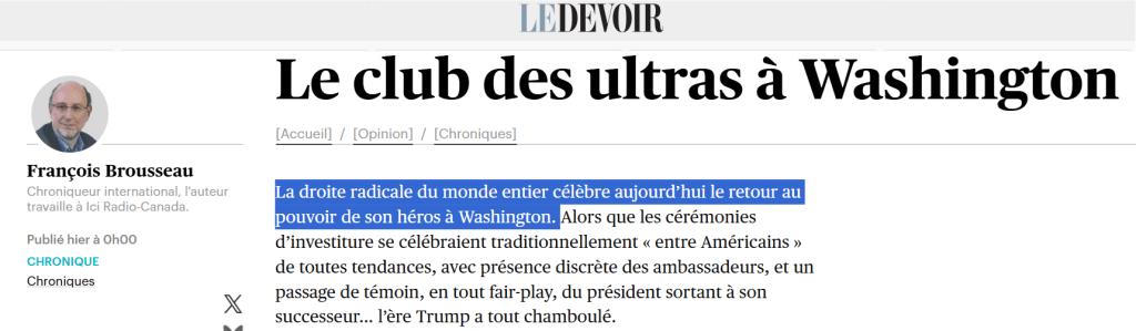 Au lendemain de l’investiture de Donald Trump, Le Devoir nous « informe », sous la plume de François Brousseau :