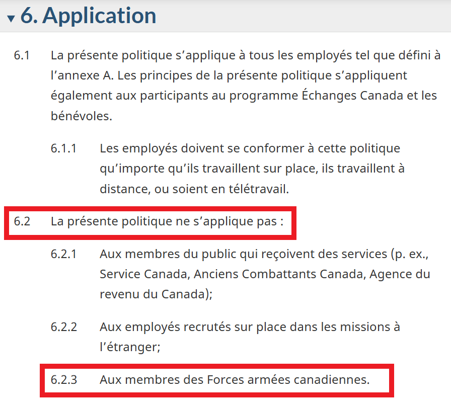 L’absurdité dans ce dossier, c’est que la « Politique sur la vaccination contre la COVID-19 applicable à l’administration publique centrale, y compris à la Gendarmerie royale du Canada », une politique de Justin Trudeau, entrée en vigueur le 6 octobre 2021 et annulée en octobre 2024, ne s’appliquait même pas aux FAC!