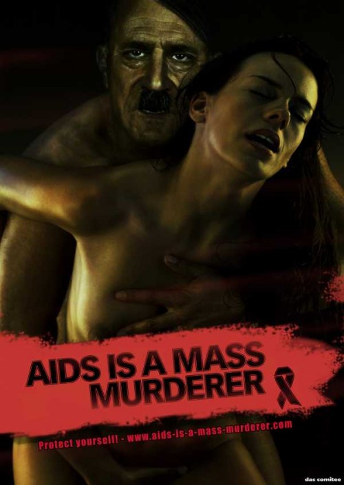 La pub la plus éloquente du lot est sans aucun doute celle-ci, qui atteint le point G…odwin : Sida = Hitler. On peut voir Hitler qui prend une femme par en arrière avec le message en allemand : « Le sida est un meurtrier de masse. Protège-toi! »
