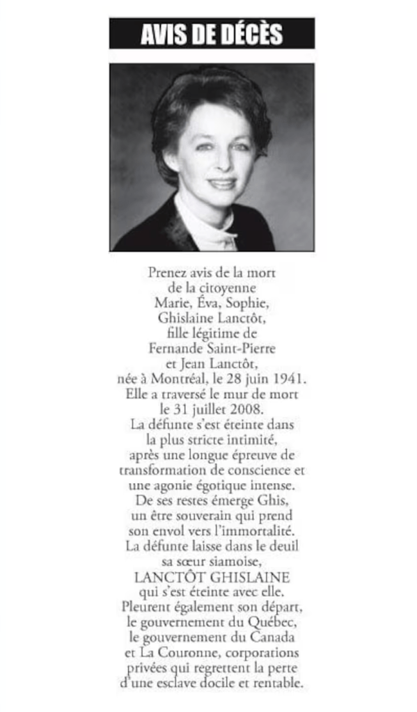 Ghislaine Lanctôt est morte le 31 juillet 2008 (voir l’avis de décès plus bas).