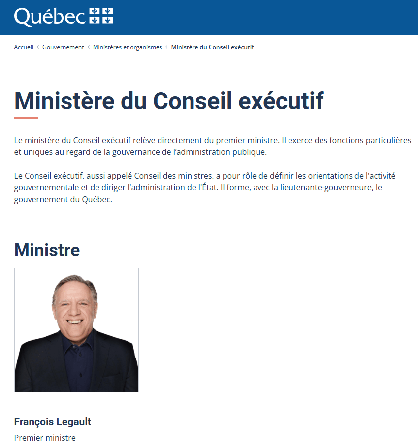 Capture d’écran du site Web du ministère du Conseil exécutif du Québec.