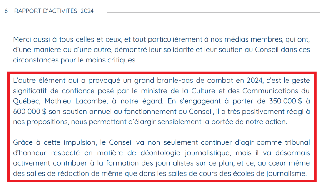 « L’autre élément qui a provoqué un grand branle-bas de combat en 2024, c’est le geste significatif de confiance posé par le ministre de la Culture et des Communications du Québec, Mathieu Lacombe, à notre égard. En s’engageant à porter de 350 000 $ à 600 000 $ son soutien annuel au fonctionnement du Conseil, il a très positivement réagi à nos propositions, nous permettant d’élargir sensiblement la portée de notre action. Grâce à cette impulsion, le Conseil va non seulement continuer d’agir comme tribunal d’honneur respecté en matière de déontologie journalistique, mais il va désormais activement contribuer à la formation des journalistes sur ce plan, et ce, au cœur même des salles de rédaction de même que dans les salles de cours des écoles de journalisme. »