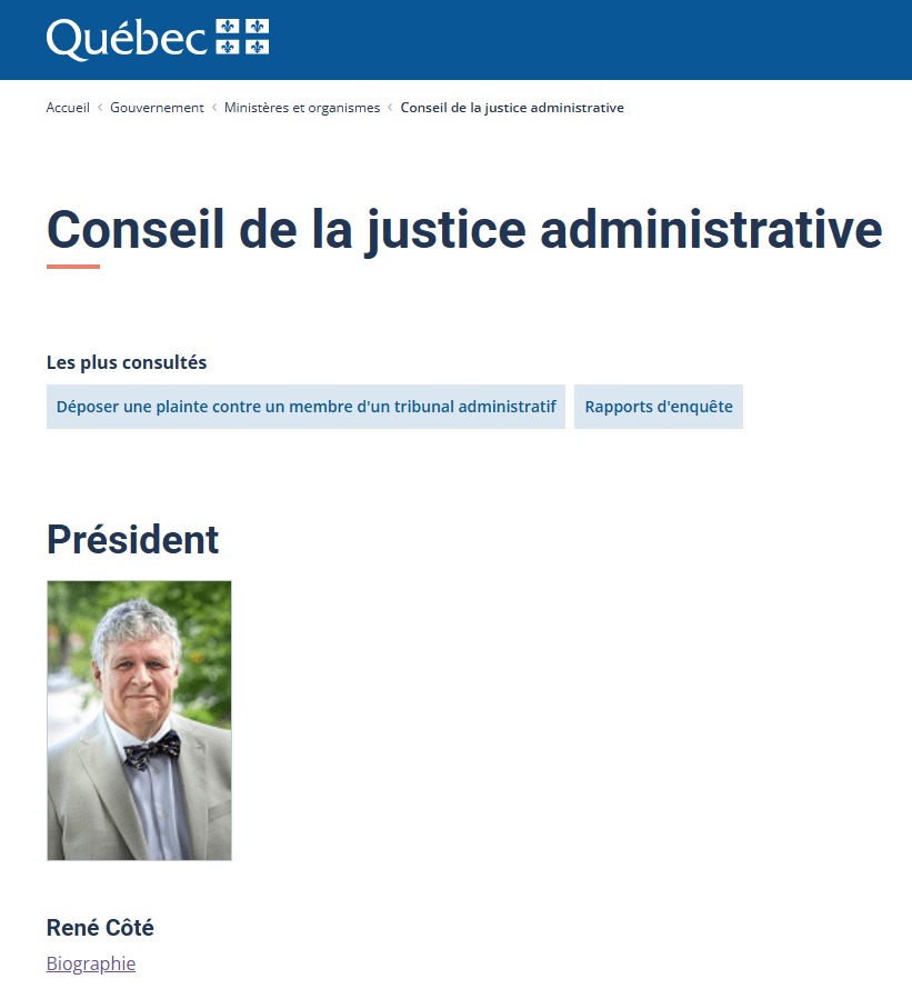 « Monsieur René Côté a été nommé membre et désigné président du Conseil de la justice administrative le 30 juin 2020 par le conseil des ministres. »