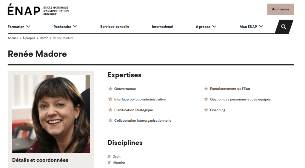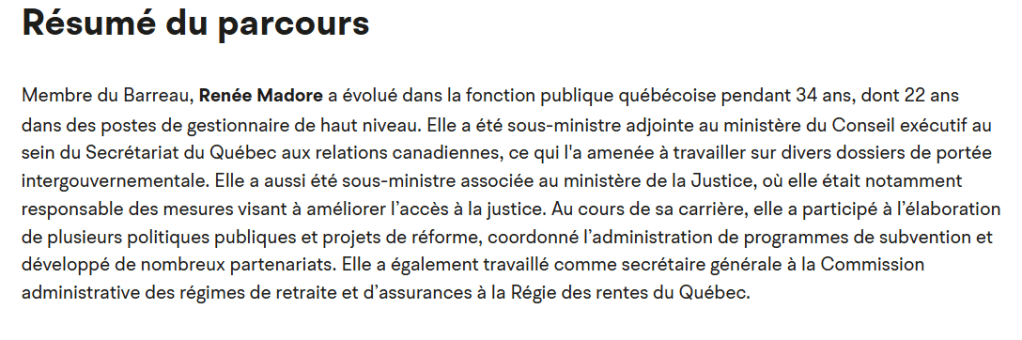 L’impressionnante biographie de Renée Madore sur le site de l’ENAP se lit comme suit :