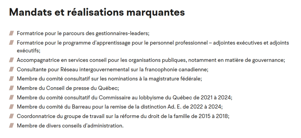 • Membre du comité consultatif du Commissaire au lobbyisme du Québec de 2021 à 2024;